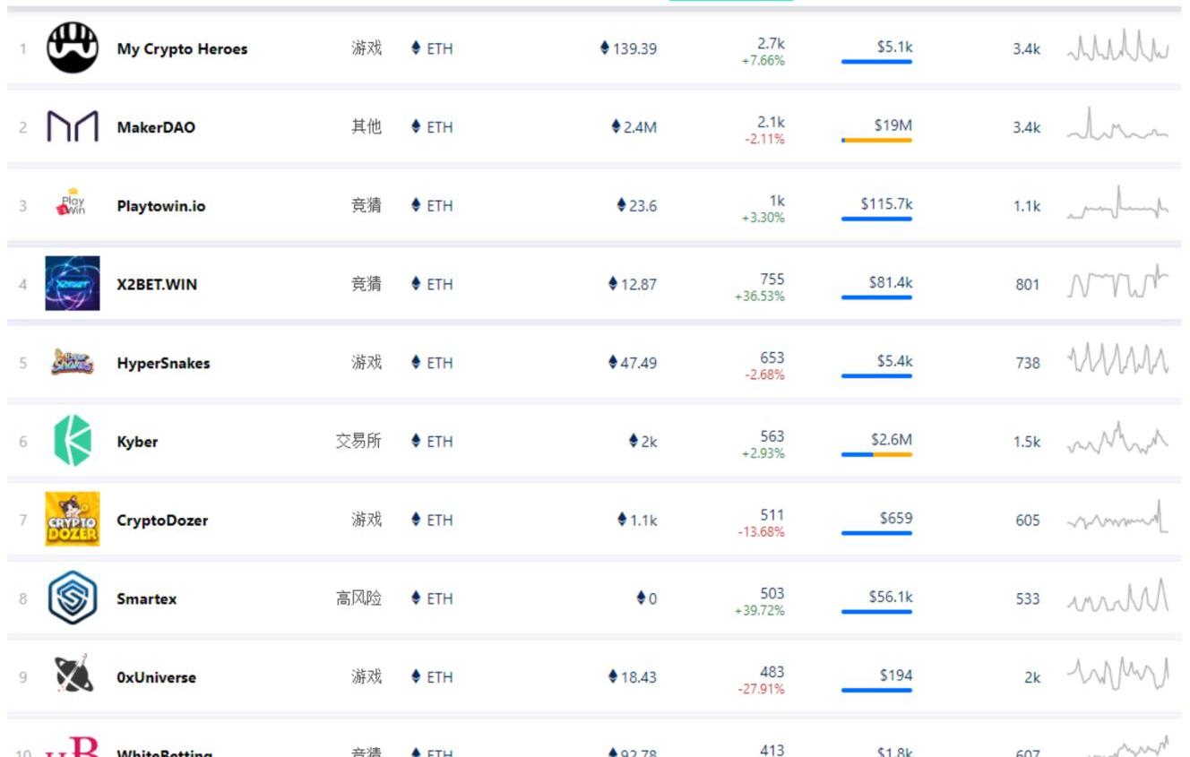 觀察DappRadar統計數據,24小時ETHDApp整體活躍程度略有回升。游戲應用MyCryptoHeroes的24小時活躍用戶數2.7k,24小時變化+7.66%;金融應用MakerDAO的24小時活躍用戶數2.1k,24小時變化-2.11%。