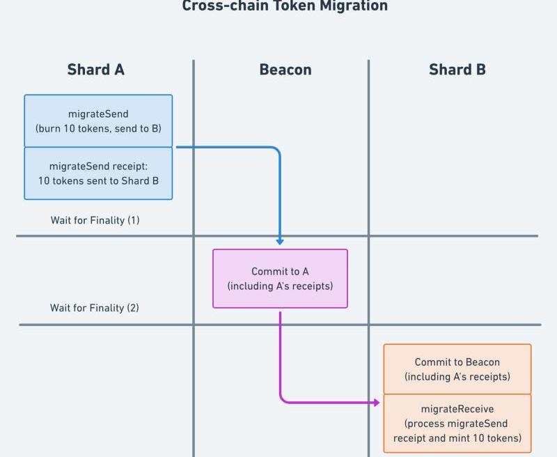 當分片A上的用戶或合約想與分片B交互時,需要讓分片A驗證者委員會成員在信標鏈上寫入關于分片的可驗證信息。分片A會將它的所有收據打包到它的區塊頭中。信標鏈等待分片A就包含該收據的區塊達成共識后,將分片A的區塊頭打包到信標鏈中。分片B等待信標鏈完成區塊共識后,才能將包含分片A該區塊頭的信標鏈區塊頭打包進分片B的區塊中,從而達成片內共識。如果分片B上的合約想要發送回復信息,就需要將整個過程倒過來:分片B生成一條收據,最終在分片A中生效。