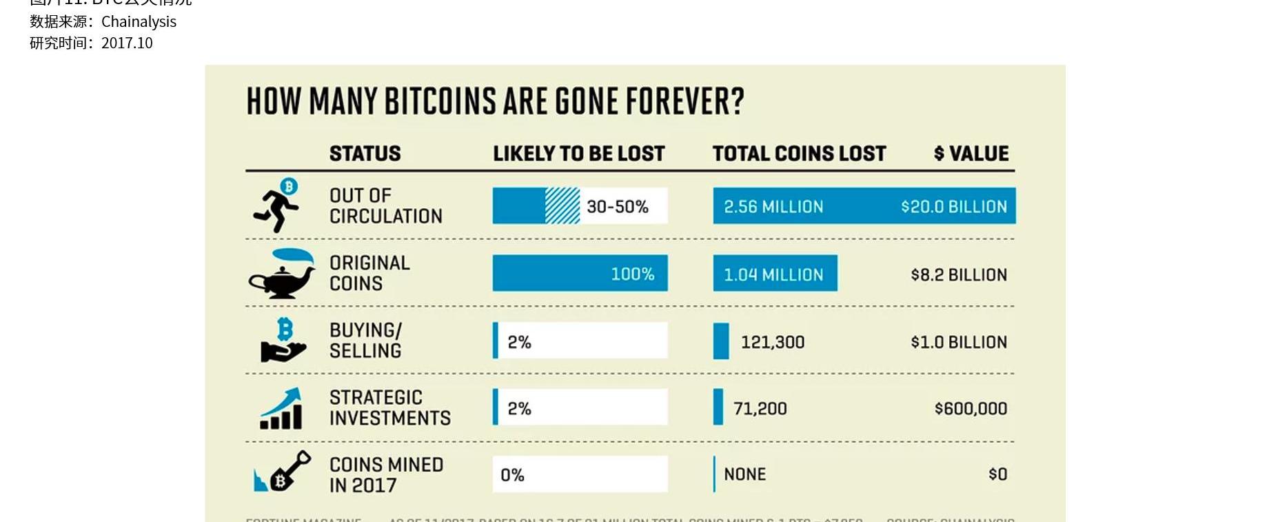 Chainalysis于2017年對Bitcoin網絡進行數據分析,表示永久丟失的BTC數量在278萬至379萬之間,占據當時被挖掘總量1670萬枚的17%~23%。
