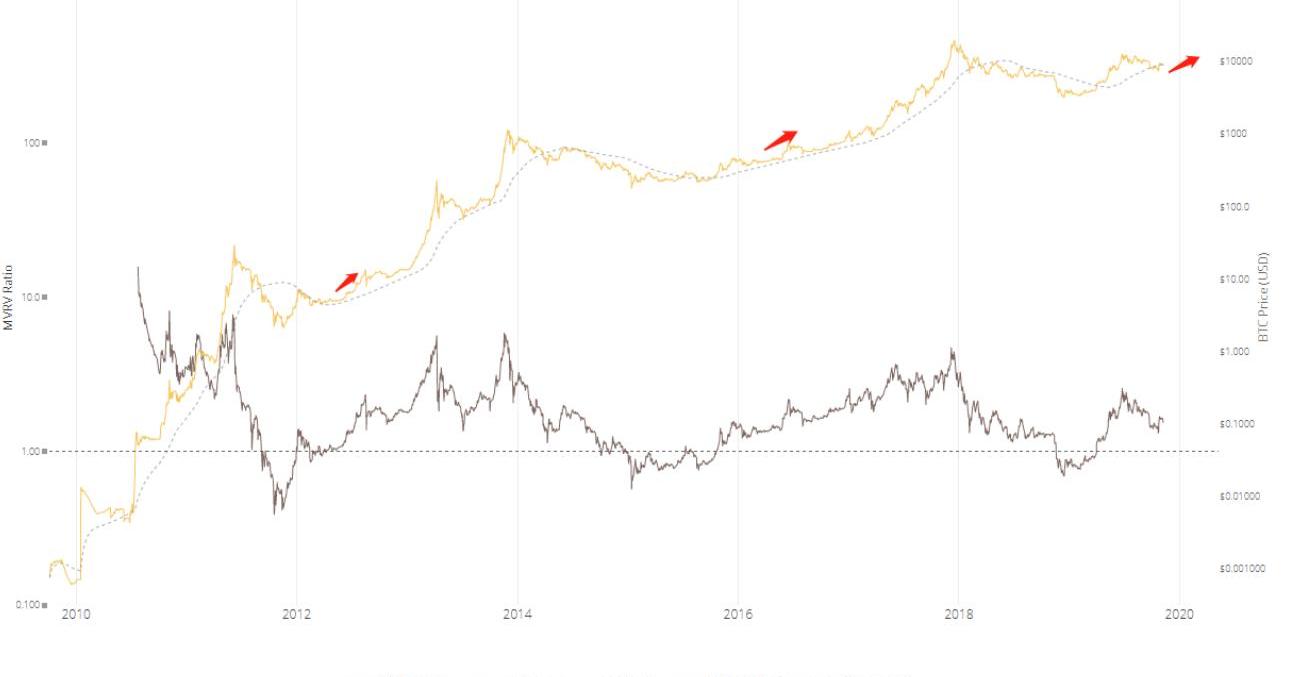 第一次減半前出現了一個明顯的上漲行情,而在此之前的半年有一個大漲之后的大幅回調階段。對應的,反映二級市場供需失衡程度的指標MVRV,從2012年01月的1.40下降到2012年05月的1.02,進而又沖上2012年08月的2.34。