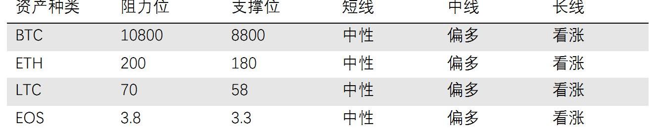 BTC長期趨勢向好,目前處于局部回調階段,瘋牛行情很可能在未來一至兩年到來,加倉。智能合約平臺龍頭ETH、山寨幣龍頭LTC、DPoS龍頭EOS的BTC相對價格接近年內低點,可適當配置。