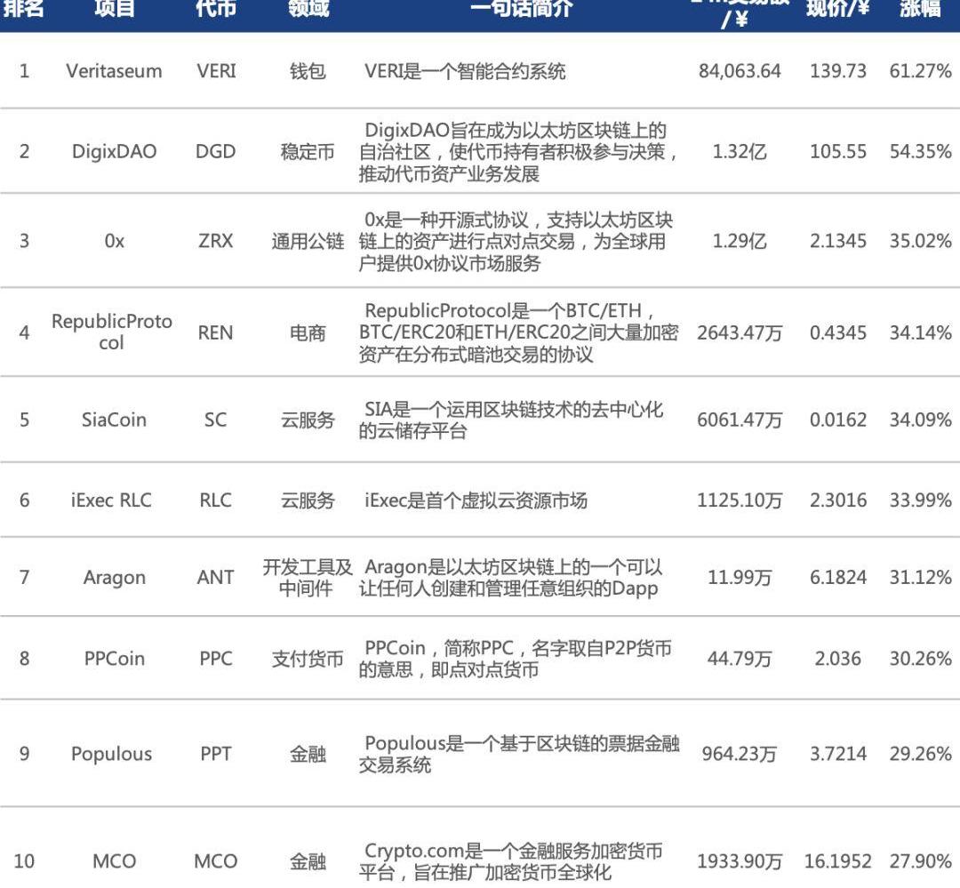從個幣漲幅來看,上周市值TOP200的資產中,VERI較上一周漲幅最高,達到61.27%。