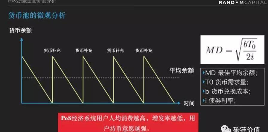 在PoS系統中,兌換成本b是解鎖Staking損失的利息,由利率和解鎖周期決定。把此條件帶入鮑莫爾—托賓模型的公式,得出的結論是:最佳平均余額是在一個解鎖周期內用戶消費貨幣量的一半。這個結論完全符合直覺,并不需要數學推導。還是假定每天消費1塊錢,如果從債券兌換成現金沒有手續費,但需要30天的解鎖周期。那么最優的方式顯然是每次兌換30元,30元到手的時候上次兌換的錢正好花完,然后馬上發起下一次兌換請求。所以最優的平均現金余額是30/2=15元。