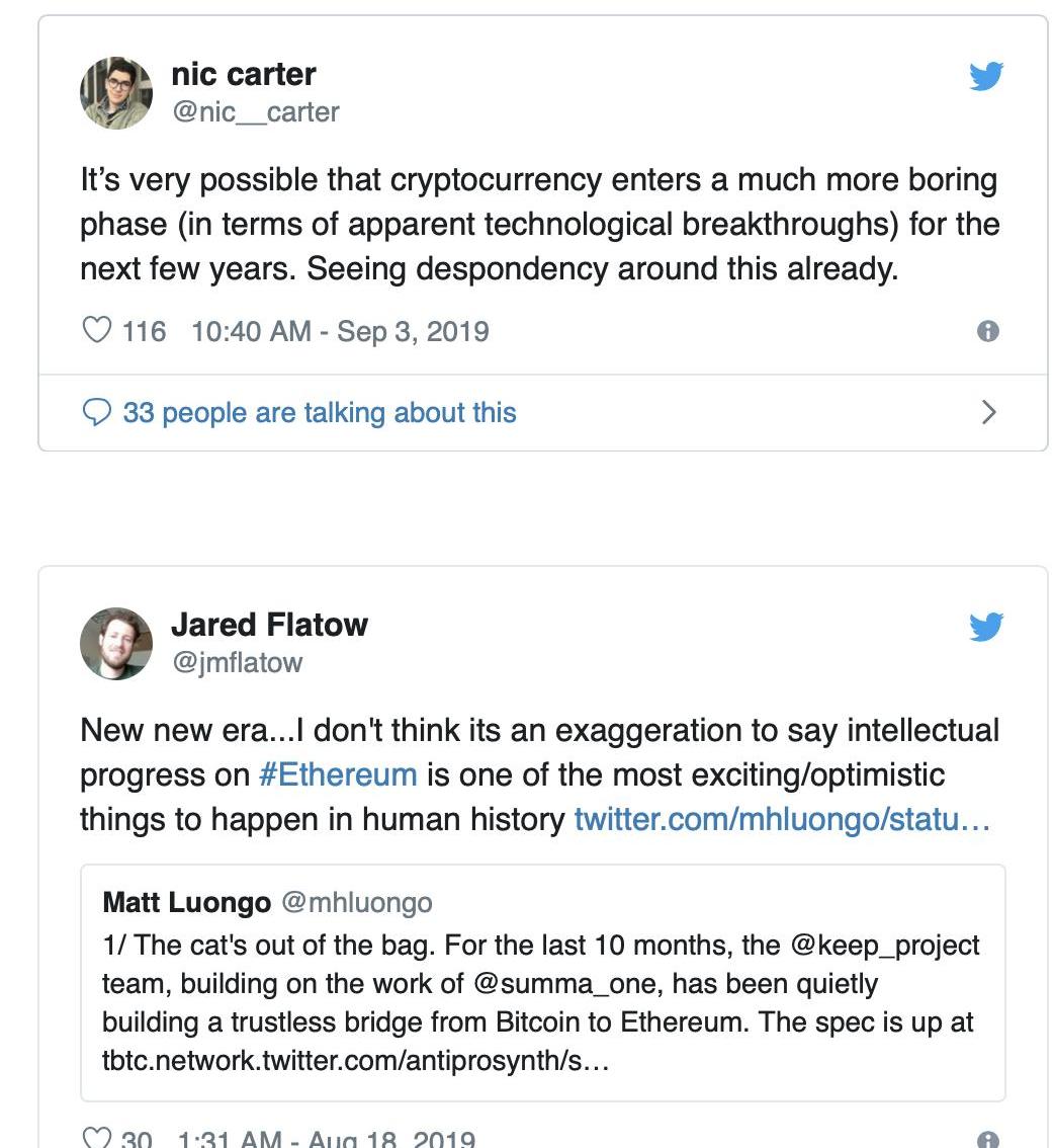 “在接下來的幾年里,加密貨幣很有可能進入一個無聊得多的階段(就明顯的技術突破而言)。我已經看到周圍的絕望。”