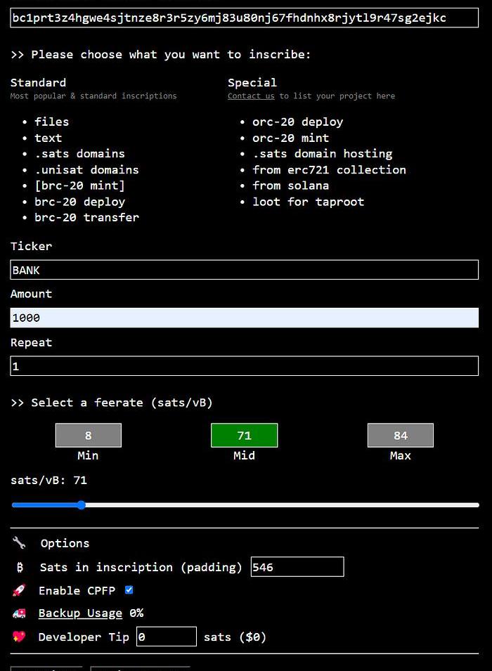 2、輸入您的地址、ticker、鑄幣量、重復次數。選擇feerate并inscribe
