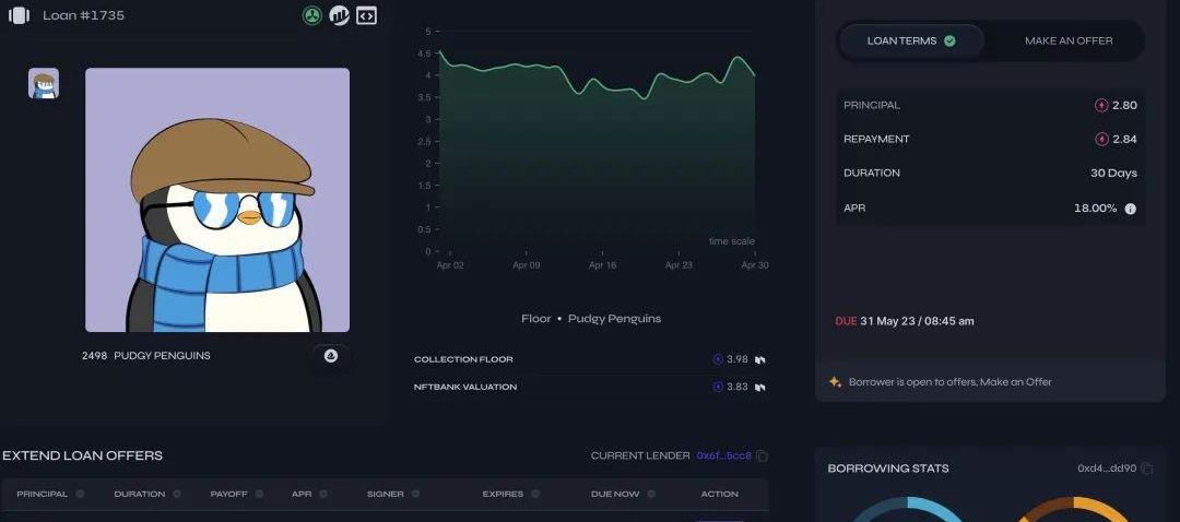 因此,有三種可能發生的情況:a.借款人在30天結束之前償還貸款,他們的Penguin將被轉回他們的錢包。b.借款人在30天內未償還貸款,借出方現在可以索取這個Penguin。c.借款人接受延期貸款,并展期貸款。點對點這種模式的一個主要優點是可自定義的條件和貸款價值比。LTV=本金/NFT的價值較高的LTV,意味著較高的風險和較高的收益。這個特征意味著,對于愿意承擔較高風險并且對更稀缺的NFT的市價有一定了解的借出方來說非常適用。