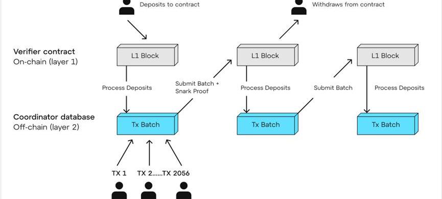 Zk-rollups通過在一個單獨的環境中執行交易,從而減輕了以太坊的計算負載。在一定的時間間隔內,rollup的操作員會將許多用戶交易聚合成一批,并提交給以太坊上的智能合約。它還提交一個有效性證明,確認鏈下交易正確執行,新的狀態是正確的。