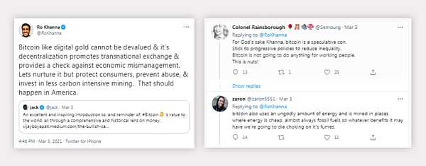 “比特幣就像數字黃金不會貶值,它是去中心化的,能促進跨國交易,并且為經濟管理不善提供風險對沖。讓我們發展這個行業吧,保護消費者、防止濫用、投資碳排放更少的比特幣挖礦吧。美國應該這么做。”Ro Khanna于上周三在一條推文中寫道。