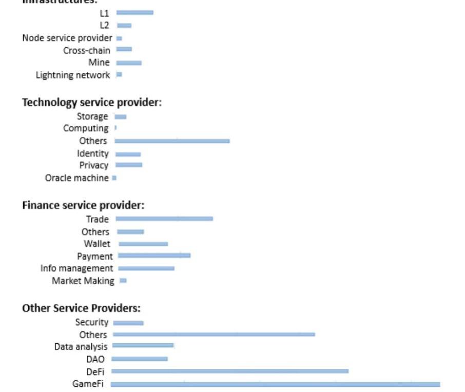 為了方便讀者理解,我們簡單地用二分法來劃分整個行業,所有能與用戶直接互動的產品被稱為應用,包括DeFi協議、游戲、錢包、交易所等,至于那些不能在互動中被感知但仍支持Web3運行的產品被稱為基礎設施,包括公鏈、節點服務提供商、數據索引、開發者工具等。