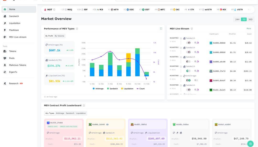 Eigenphi是一個針對DeFi的流動性分析的工具,主打MEV交易及其關聯分析。目前EigenPhi提供實時的MEV數據,包括套利、三明治攻擊、清算、閃電貸行為的實時監控數據,同時還提供當前交易熱度最高的代幣和流動性資金池的相關交易數據,以及對惡意代幣的識別。