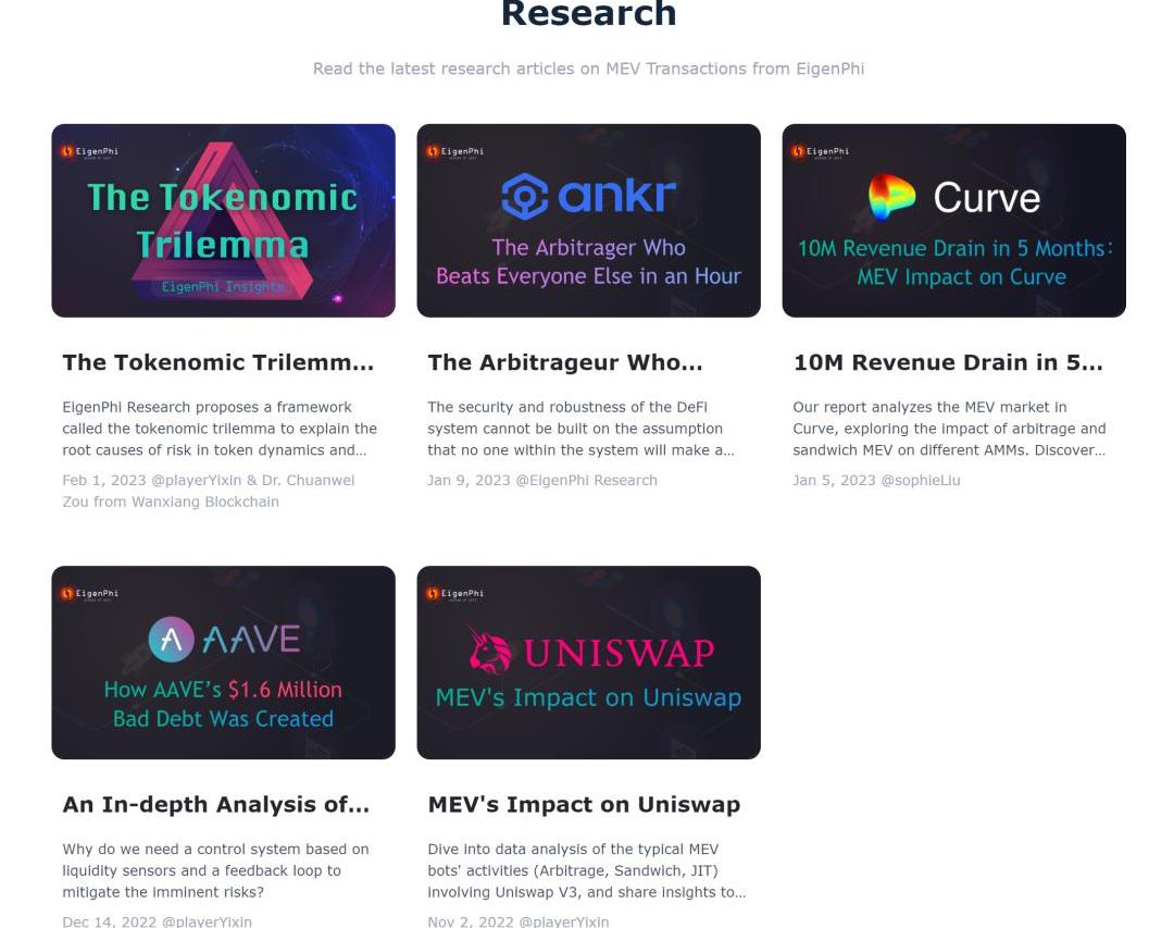 EigenPhi在官網有研究專欄,提供了針對DeFi領域中MEV套利、流動性、安全事件的數據分析研究報告。