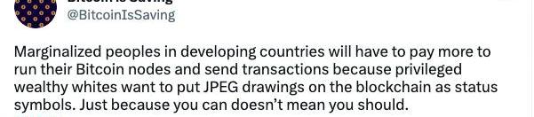 擁有近30萬粉絲的比特幣社區KOL「BitcoinisSaving」認為,NFT頭像是一種特權身份象征,只有那些富裕的投資者才有機會獲得,如果網絡費用大幅增加勢必會把更多邊緣人群排除在比特幣網絡之外,不利于推動加密采用。