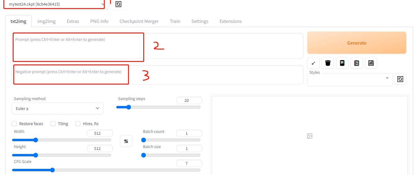 WebUI的主頁如下,1處選擇使用的模型,2處輸入描述詞,也就是你對想要輸出圖片的內容,3處輸入負面描述詞,也就是你不想要圖片出現什么內容,3可以空著不填。填寫完描述詞后點擊生成圖片。