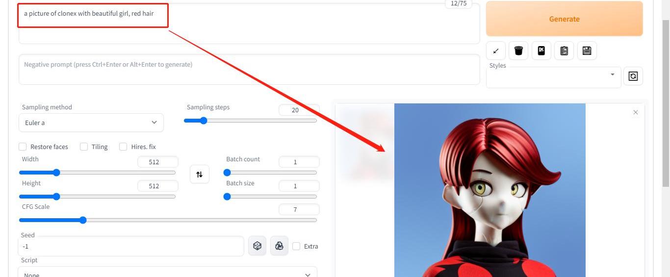 簡單測試,這里輸入提示詞“apictureofclonexwithbeautifulgirl,redhair”,結果應該會出現一個紅色頭發的女生CloneX形象,效果如下圖: