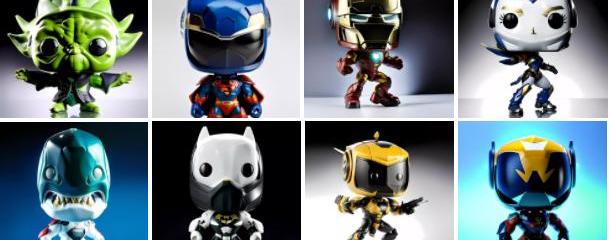 注:只需要改變括號中的內容就可以得到相同類型的圖片,示例文字順序=圖片順序,圖片內角色依次為Yoda、Superman、ironMan、MaiShiranui、shark、batman、Bumblebee和wizard。你可以嘗試所有其他可能性。Funkypopfigurine,madeofplastic,productstudioshot,onawhitebackground,diffusedlighting,centered