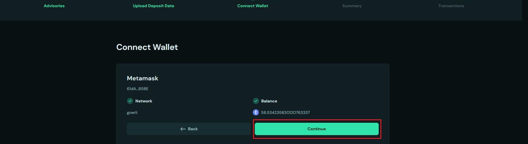 一旦所有操作員都成功簽名,您的屏幕將自動前進到下一步,如下所示。點擊?Continue.如果您關閉了標簽,只需返回領導分享的邀請鏈接并連接您的錢包即可。