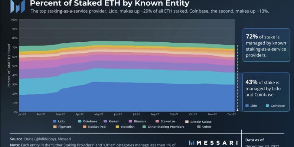 盡管如此,大部分質押的ETH仍由少數質押即服務(Staking-as-a-service)提供商控制。具體來說,最大的質押即服務提供商Lido占ETH質押量的近30%,而第二大領導者Coinbase的占比略高于13%。