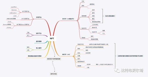 開篇的全景圖是目前NFT領域的一個視角,從我的角度我會區分為NFT概念幣與NFT,其中覆蓋到的領域包括藝術、競技體育、二次元周邊、社交、版權、虛擬世界、公益等等領域,這其中包括了NFT與DEFI、NFT與公鏈、NFT與公益等的不同形式的結合。