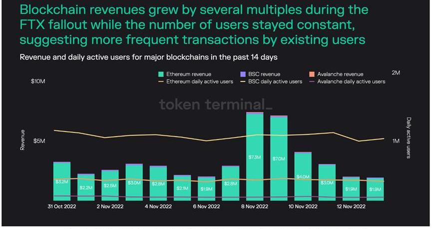 數據還顯示,區塊鏈的營收在日活躍用戶的恒定比率下不斷增長。與前幾周相比,主流區塊鏈網絡的日收入增長了300%以上。