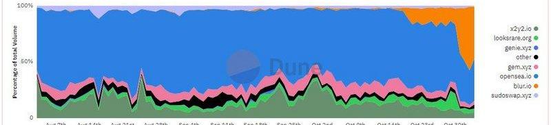 10月20日,Blur啟動了首輪代幣盲盒的空投,并快速獲得了市場的廣泛關注。根據官方規劃,Blur在?11月中還將進行第二輪空投,且該輪空投的規模要比首輪空投“大得多”。由于第二輪空投明確指出需要“交易”活動,因此在空投預期的支撐下,Blur的交易量在過去幾天也實現了激增,這反過來又進一步拉高了市場對于Blur第二輪空投的期待值。