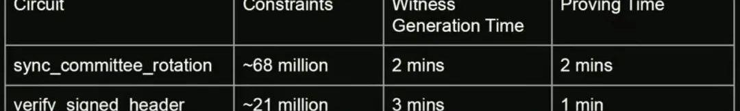 以太坊輕客戶端在Gnosis鏈上使用Solidity智能合約,而鏈下計算包括構建circom電路以驗證驗證者及其BLS簽名,然后計算zk-SNARK證明。在此之后,區塊頭和證明被提交給智能合約,然后智能合約在Gnosis鏈上執行驗證。SNARK計算部分的電路大小和驗證時間總結如下:
