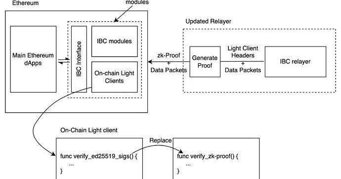 此設置與前面討論的情況類似,但方向相反,其中輕客戶端(來自CosmosSDK)需要在以太坊上的智能合約中進行驗證。從實際意義上講,在以太坊上運行來自其他區塊鏈的輕客戶端似乎具有挑戰性。在CosmosSDK中,Tendermint輕客戶端運行在扭曲的Edwards曲線(Ed25519)上,以太坊鏈本身不支持該曲線。因此,以太坊(BN254)上Ed25519簽名的鏈上驗證變得低效且成本高昂。