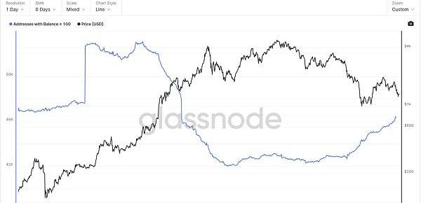 ??????BTC地址數:持幣100以下的地址數進場,持幣100以上的地址數開始下跌。