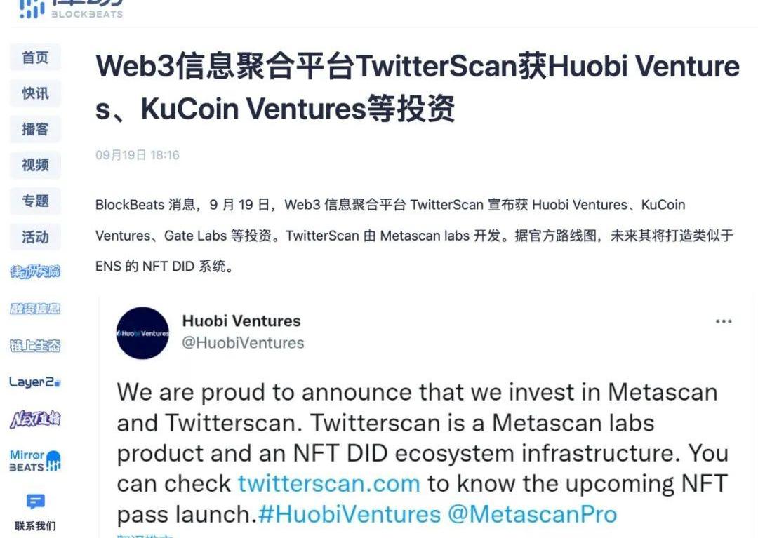 TwitterScan的開發團隊是Metascanlabs,在9月19號剛宣布完種子輪的融資,具體融資額度尚未披露,但投資方陣容還頗為強大,有OKX、HuobiVentures、KuCoinVentures、Element、抹茶MEXC、Gate、分布式資本、Cobo等頂級機構。
