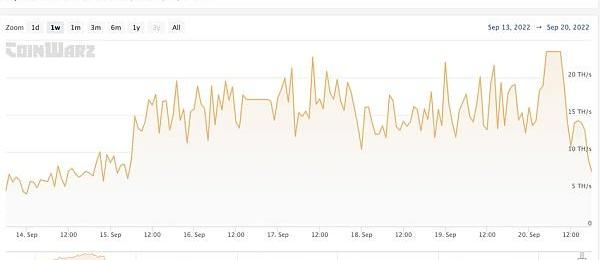 與顯示出哈希率穩步上升的以太坊經典不同,Ravencoin的哈希率顯示出更加變化無常的礦池。在合并當天,Ravencoin的哈希率從9.64TH飆升至19.57TH,然后跌至11.22TH。Ravencoin的哈希率在接下來的一周繼續波動,今天一度高達23.50TH,然后再次跌至7.34TH。