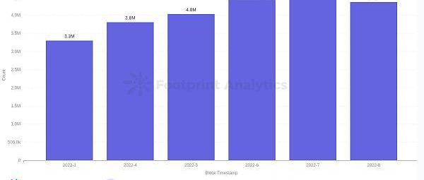有趣的是,NFT的月交易次數沒有明顯下降。在連續5個月可觀的漲幅之后,8月僅出現8.5%的小幅回落。這表明,盡管宏觀趨勢對NFT價格造成嚴重的打擊,但該技術本身仍在繼續獲得動力。