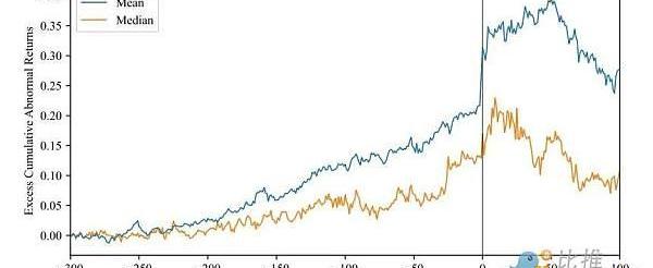 假設所列公告列表中存在內幕交易,那么將發生在加密貨幣在DEX上幣前。DEX無需了解您的客戶(KYC)或反洗錢(AML)要求,并為個人提供匿名和不受限制的偽交易機會。盡管沒有直接的KYC或AML要求,但DEX是完全透明的,所有交易都在區塊鏈上公開可用。我們將該組中的代幣標記為可能的內幕交易組,以便我們可以將其特征與不太可能參與內幕交易的代幣進行比較;該組包含98個列表。我們收集了在上幣公告前300小時至公告后100小時代幣上幣的價格變動數據,以監測任何可能成為內幕交易潛在證據的異常交易模式。圖1顯示了LTIG組的累積異常回報的平均值和中位值。目測來看,在上幣公告前250小時開始存在明顯的上漲趨勢,并一直持續到正式上幣公告時。由于新信息進入市場且交易員會對此作出反應,公告前還會有大幅上漲。我們觀察到的上漲趨勢與被起訴的股票市場內幕交易案件的上漲趨勢一致。