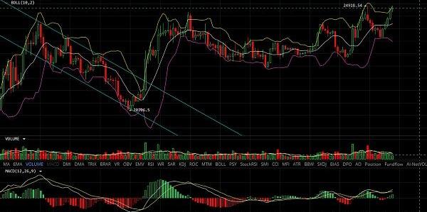 大餅昨日白盤呈震蕩走勢,上下波動幅度較小,下午插針誘多連陰下行,低位跌至23600附近支撐反彈,行情一路連陽高位觸及24750附近,恭喜跟上昨日思路的朋友多單獲利1200點空間,多單減倉繼續持有,四小時級別行情再次v型反轉,昨日走勢先下后上和思路一致,k線四連陽,macd多頭排列雙線金叉狀態,kdj三線金叉向上延伸,目前多頭走勢較為強烈,短期阻力25000只是時間問題,大目標看向27000一起做時間的朋友,方向已經走出回踩就是進多機會,日內繼續看漲,24500-24200多,目標25000-25500
