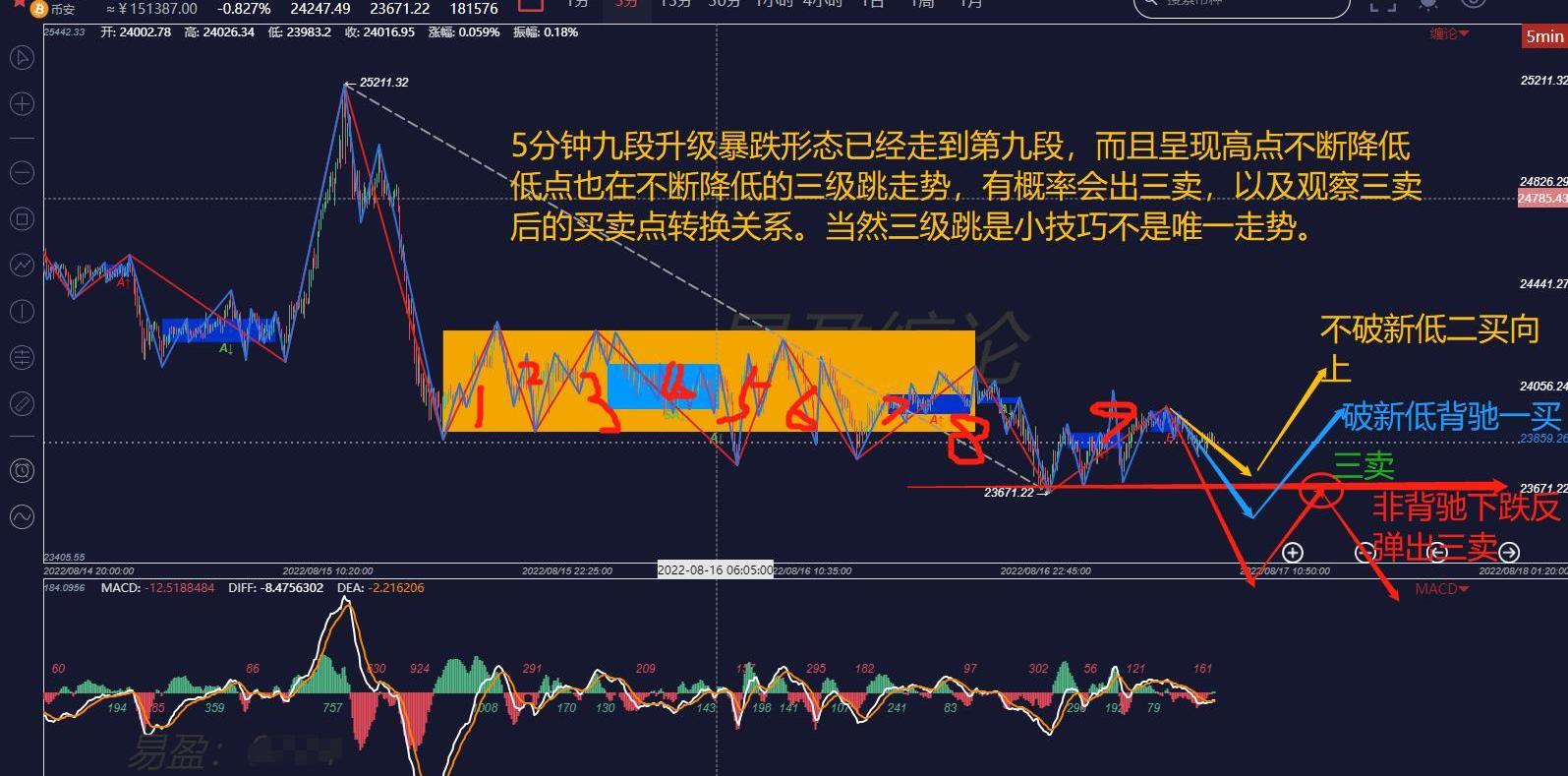 短線5分鐘看,一直處于中樞震蕩之間,當下已經震蕩到第九段,有九段升級形態破前低預期,當然圖中幾種走勢均有可能,只是哪種走勢概率大小問題。開倉必帶止損。