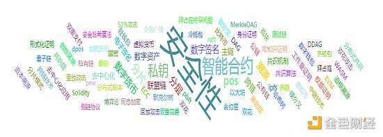 根據區塊鏈之家收錄的國內區塊鏈相關專利,繪制出熱詞分布,如圖1-11所示,國內區塊鏈相關專利摘要中關注最多的是安全性方面,其次是智能合約、共識機制、密碼算法、跨鏈、存儲等方面。