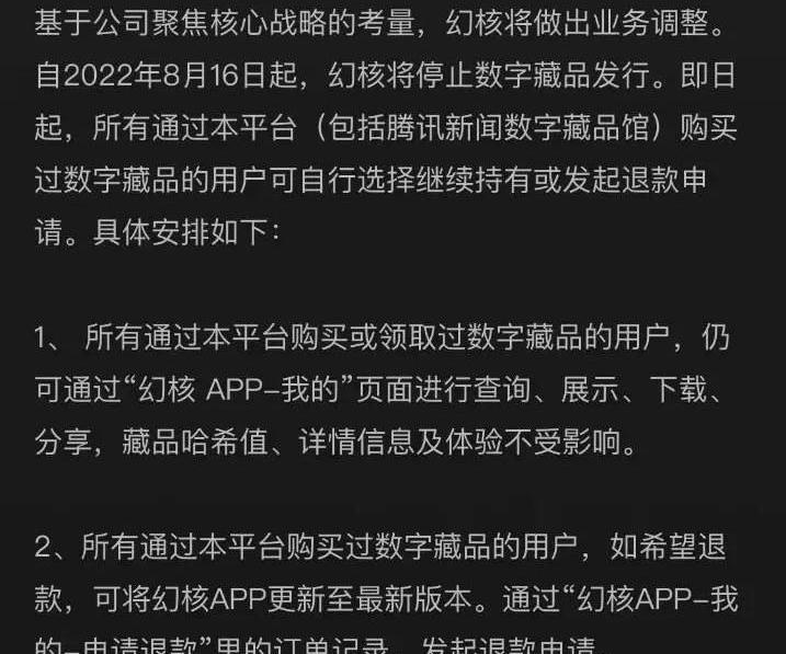 XRP/HKD+2.21%自上月20日爆出騰訊正計劃,在近期關停旗下數字藏品平臺“幻核”業務的消息后,騰訊新聞App也暫停了數字藏品相關售賣服務的提供,而至此上線于2021年8月的“幻核”將將運作不滿一年時間。消息一出,引起了一陣慌亂,眾多用戶趕忙抓緊時間處理手上囤積的數字藏品,各類社群里也不再有過往熱鬧異常的場景,所有人都在及時止損的同時靜靜的等待事件的結果,而時隔一個月的今天,這第二只靴子最終還是重重的落下了,幻核貼出了公告正式通知自2022年8月16日,即日起停止幻核數字藏品發行。