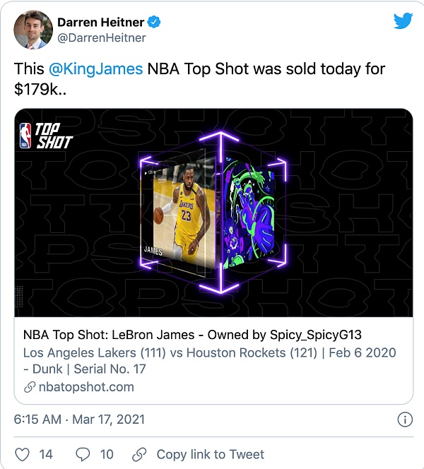 NBA在2019年推出了Top Shot,這是一個專門方便用戶通過區塊鏈技術收集和交易NBA精彩視頻的市場。它自成立以來已經累計實現2.3億美元銷售額,勒布朗·詹姆斯(LeBron James)和錫安·威廉姆森(Zion Williamson)的個人視頻都賣出了20萬美元左右的單價。上月,美國網絡視頻達人羅根·保羅(Logan Paul)以NFT形式出售了一些帶有自己卡通形象的寶可夢卡片,總金額超過500萬美元。電子音樂制作人3LAU也在2月27日發布了限量版NFT專輯,不到24小時就賣出逾1160萬美元。